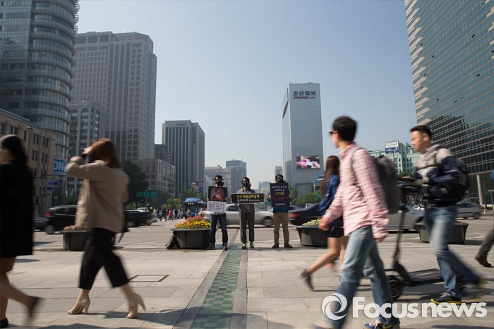 (서울=포커스뉴스) 17일 오전 서울 종로구 광화문광장 인근에서 서울환경연합원들이 경유차 활성화 정책 철회를 촉구하며 퍼포먼스를 벌이고 있다.