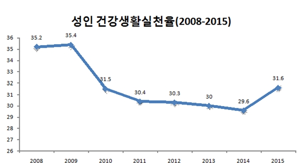 17일 질병관리본부(본부장 정기석)가 만19세 이상 성인을 대상으로 조사한 ‘2015년 지역사회건강조사’에 따르면 금연, 절주, 걷기의 3가지 건강생활을 모두 실천하고 있는 성인은 31.6%로 2014년 대비 소폭 증가했다.