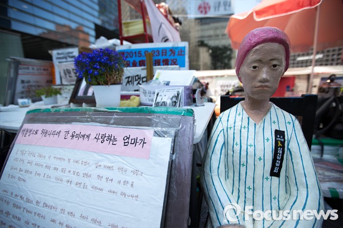 (서울=포커스뉴스) 17일 오전 서울 서초구 서초동 삼성전자 서초사옥 앞 반올림 농성장에서 열린삼성직업병 문제 올바른 해결을 촉구하는 반올림 기자회견장 옆에 삼성반도체 사업장에서 근무하다 백혈병으로 사망한 황유미씨의 추모상이 놓여져 있다.