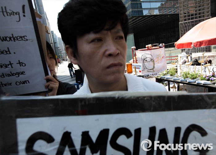 (서울=포커스뉴스) 17일 오전 서울 서초구 서초동 삼성전자 서초사옥 앞 반올림 농성장에서 반올림 관계자들이 삼성직업병 문제 올바른 해결을 촉구하는 반올림 기자회견을 하고 있다.