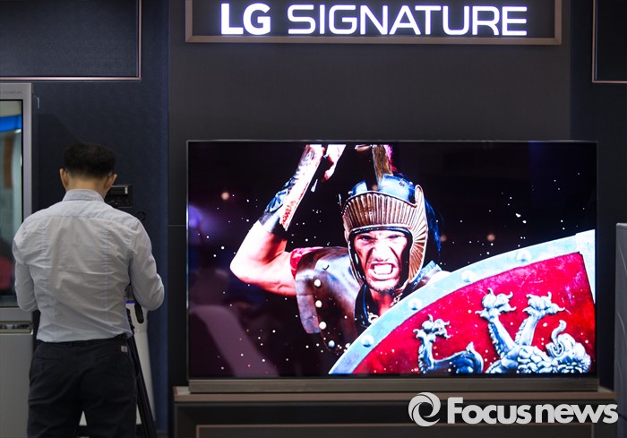 (서울=포커스뉴스) 17일 오전 서울 강남구 코엑스에서 열린 '월드 IT쇼 2016' 의 LG전자 부스를 찾은 한 취재진이 디스플레이 취재하고 있다.