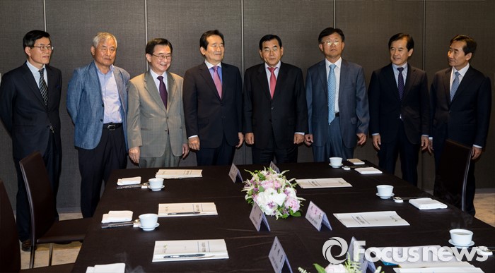 (서울=포커스뉴스) 17일 오후 서울 중구 플라자호텔에서 열린 경제사회발전 노사정위원회 역대 상임위원 간담회에서 초대 상임위원을 맡았던 정세균(왼쪽 네번재 부터) 더불어민주당 의원,김대환 위원장을 비롯한 참석자들이 기념촬영을 하고 있다.