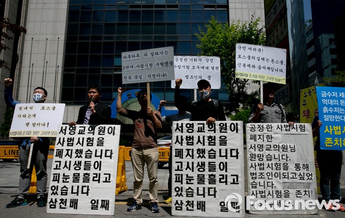 (서울=포커스뉴스) 18일 오전 서울 여의도 더불어민주당사 앞에서 사법시험 존치를 위한 고시생모임이 사시존치 법안의 법제사법위원회 전체회의 상정을 가로막은 더불어민주당 규탄시위를 하고 있다.