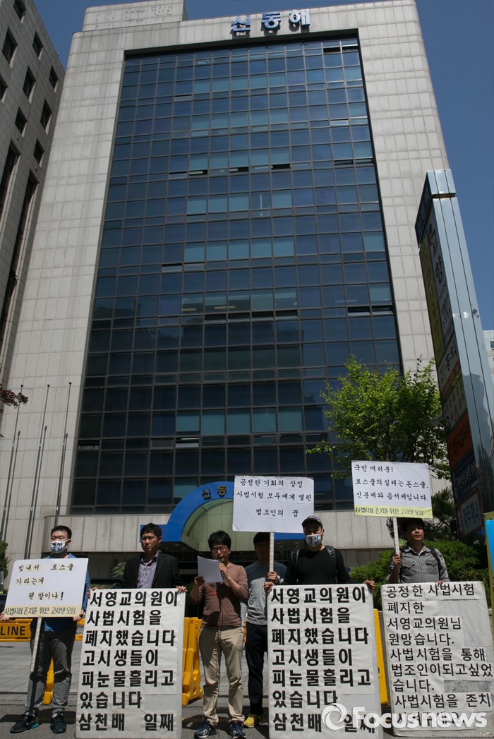 (서울=포커스뉴스) 18일 오전 서울 여의도 더불어민주당사 앞에서 사법시험 존치를 위한 고시생모임이 사시존치 법안의 법제사법위원회 전체회의 상정을 가로막은 더불어민주당 규탄시위를 하고 있다.