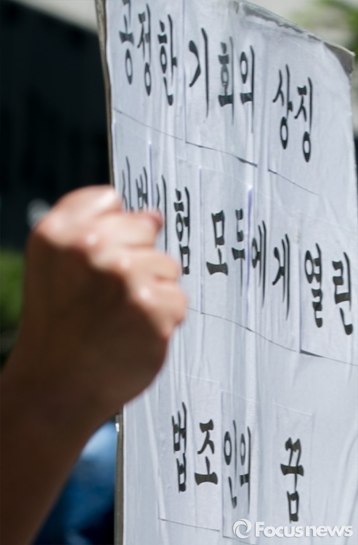 (서울=포커스뉴스) 18일 오전 서울 여의도 더불어민주당사 앞에서 사법시험 존치를 위한 고시생모임이 사시존치 법안의 법제사법위원회 전체회의 상정을 가로막은 더불어민주당 규탄시위를 하고 있다.