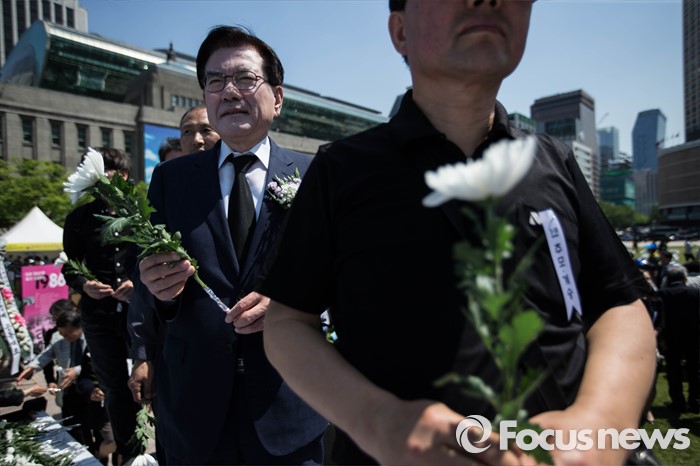(서울=포커스뉴스) 18일 오전 서울 중구 서울시청 앞 광장에서 열린 5.18 민주화운동 기념식에 참석한 시민들이 단상에 올라 헌화를 하기 위해 기다리고 있다.