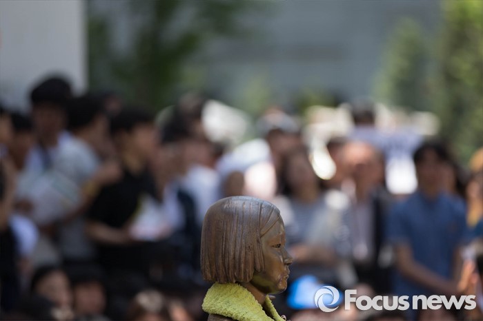 (서울=포커스뉴스) 18일 오후 서울 종로구 옛 일본대사관 앞에서 '제1231차 일본군 위안부 문제해결을 위한 정기 수요시위'가 열리고 있다.