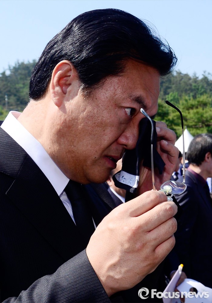 (광주=포커스뉴스) 36주년 5·18민주화운동 기념식이 거행된 18일 오전 광주 북구 운정동 5·18민주묘지에서 정진석 새누리당 원내대표가 손수건으로 얼굴을 훔치고 있다.