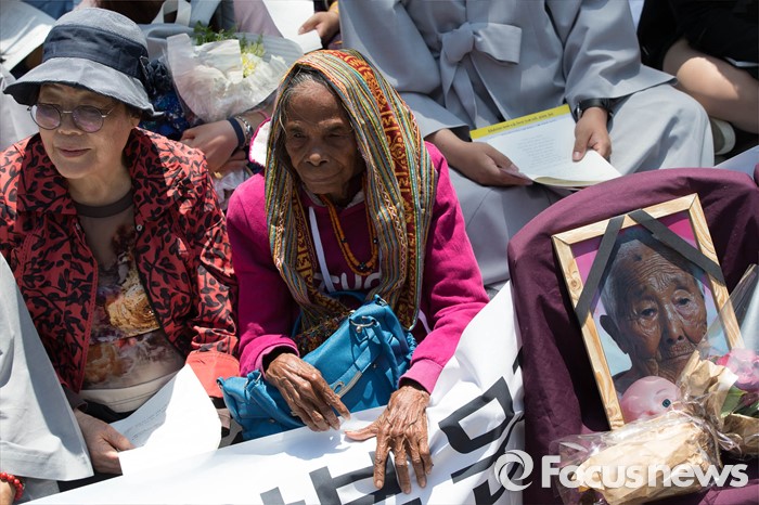 (서울=포커스뉴스) 18일 오후 서울 종로구 옛 일본대사관 앞에서 위안부 피해자 이용수(왼쪽) 할머니와 동티모르 출신 여성활동가 이네스 알메이다가 '제1231차 일본군 위안부 문제해결을 위한 정기 수요시위'에 참석하고 있다.