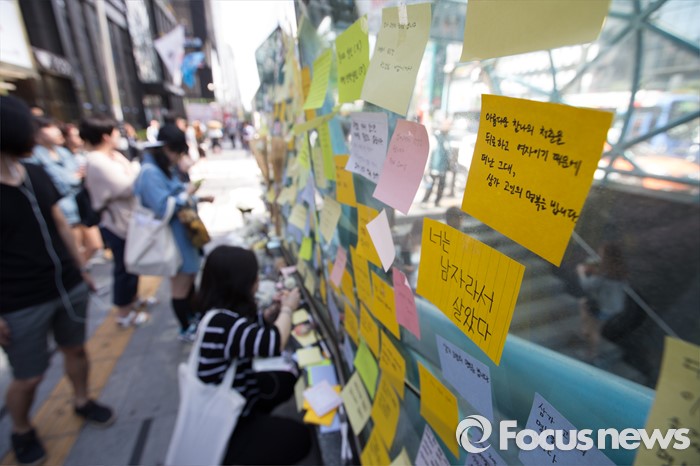 (서울=포커스뉴스) 18일 서울 서초구 강남역 10번출구에서 시민들이 '묻지마 살인' 피해자를 추모하고 있다.