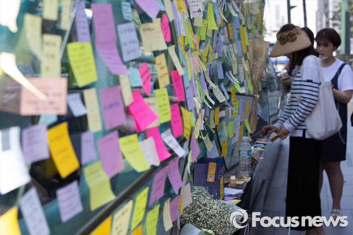 (서울=포커스뉴스) 18일 서울 서초구 강남역 10번출구에서 시민들이 '묻지마 살인' 피해자를 추모하고 있다.