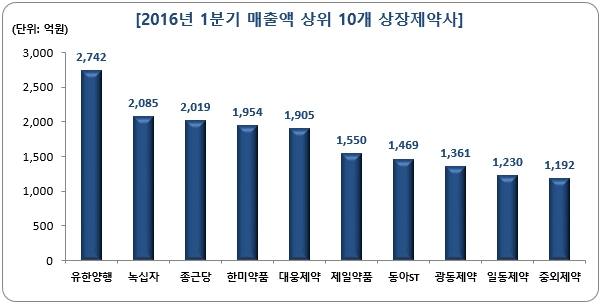 이어 한미약품(1954억원), 대웅제약(1905억원), 제일약품(1550억원), 동아ST(1469억원), 광동제약(1361억원), 일동제약(1230억원), JW중외제약(1192억원) 순으로 매출액이 높았다.