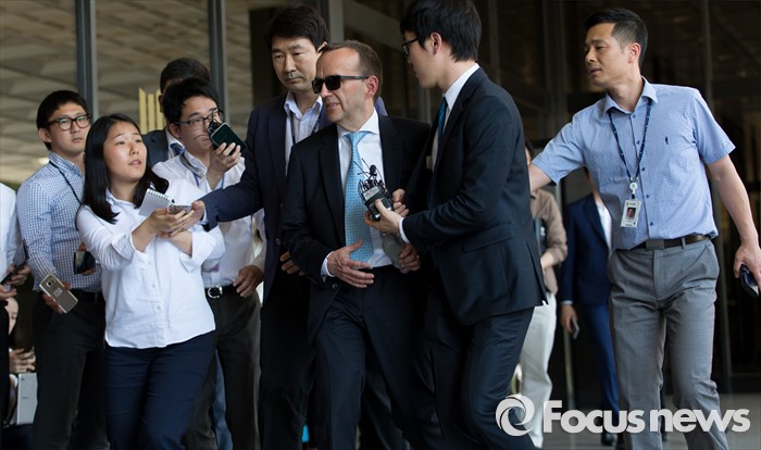 (서울=포커스뉴스) 울리히 호스터바흐 옥시 코리아 재무담당 이사가 소환조사를 받기 위해 19일 오후 서울중앙지방검찰청으로 들어서고 있다.