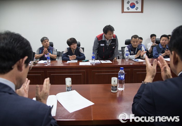(서울=포커스뉴스) 19일 오후 서울 여의도 국회 의원회관에서 조선업종노조연대 대표자들과 각 정당 의원들 간담회에서 간담회에 참석한 조선업종노조연대 대표자들이 인사하고 있다.