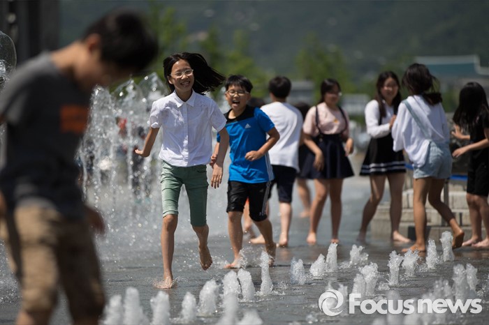 (서울=포커스뉴스) 서울의 낮 기온이 30도를 넘는 19일 오후 서울 광화문광장 분수대에서 아이들이 물놀이를 즐기고 있다.