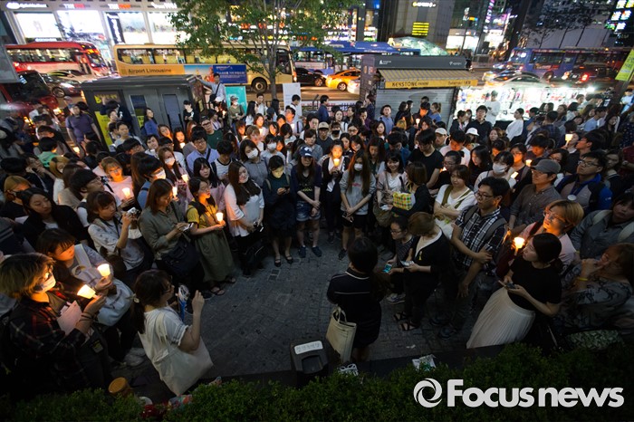 (서울=포커스뉴스) 19일 오후 서울 서초구 강남역 10번출구에서 시민들이 '강남 묻지마 살인' 피해자를 추모하는 촛불문화제를 하고 있다.
