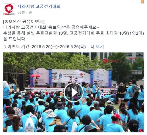 참여방법은 나라사랑 고궁걷기대회 페이스북 페이지(http://facebook.com/hiwalking)에서 '좋아요'를 누르고 타임라인에 공유한 후 댓글로 고궁걷기대회 응원 메시지를 남기면 된다. 이번 이벤트는 5월20일부터 26일까지 진행되며 27일 당첨자를 발표한다. 당첨자에게는 설빙 무료교환권(10명)과 고궁걷기대회 무료 초대권(1인2매)을 제공한다.