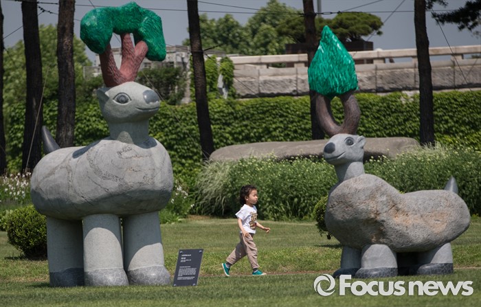 (서울=포커스뉴스) 22일 오전 서울 여의도 국회 잔디마당에서 열린 '2016 열린국회마당' 축제에서 한 어린이가 잔디밭에 놓인 대형 전시물 사이로 뛰어가고 있다.
