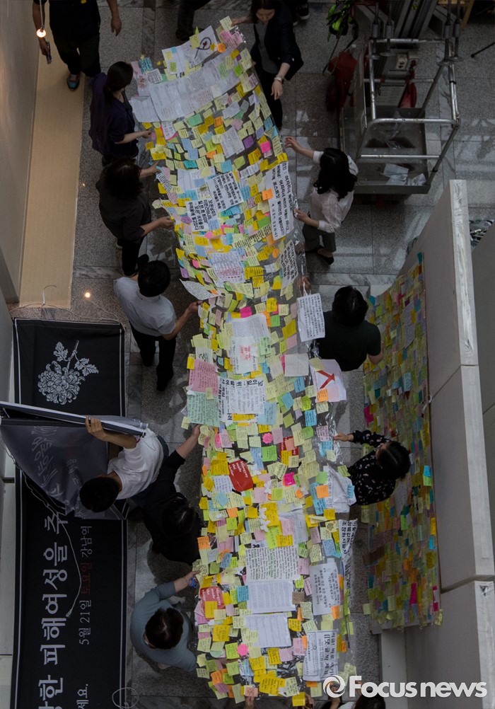 (서울=포커스뉴스) 23일 오후 서울 동작구 서울여성플라자 로비에 마련된 추모 전시장에서 여성가족재단 직원들이 강남역 묻지마 살인 피해자 추모 기록물들을 게시하고 있다.