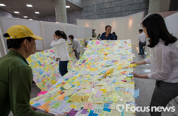 (서울=포커스뉴스) 23일 오후 서울 동작구 서울여성플라자 입구에서 서초구청 및 여성가족재단 직원들이 강남역 묻지마 살인 피해자 추모 기록물들을 전시공간으로 옮기고 있다.