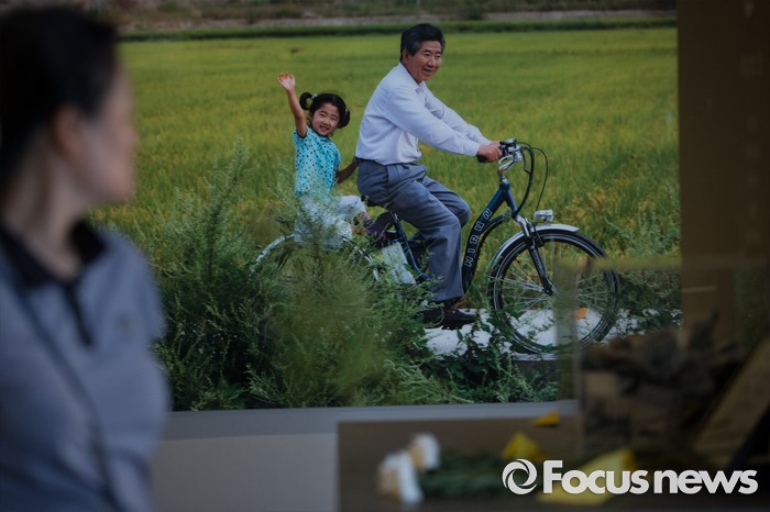(김해=포커스뉴스)故 노무현 전 대통령 서거 7주기인 23일 오후 경남 김해시 진영읍 봉하마을 '추모의 집'에 노무현 전 대통령과 함께 자전거를 타는 손녀의 사진이 걸려 있다.