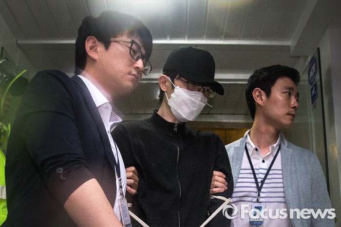 (서울=포커스뉴스) '묻지마 살인'사건의 피의자 김모(34)씨가 24일 오전 서울 서초구 서초대로의 한 상가건물에서 현장검증을 마치고 경찰차로 이동하고 있다.