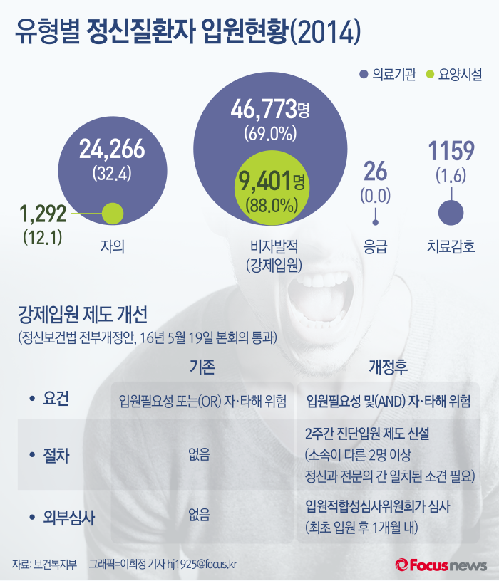 (서울=포커스뉴스) 보건복지부 자료에 따르면 2014년 입원한 정신질환자 중 정신의료기관의 69%, 정신요양시설의 88%가 비자발적 입원인 것으로 나타났다. 보건복지부는 정신보건법 전부개정안의 통과( 2016년 5월 19일)로 정신질환자에 대한 사회적차별 완화와 지원확대, 전 국민에 대한 생애주기별 정신건강 증진이 기대된다고 밝힌바 있다.