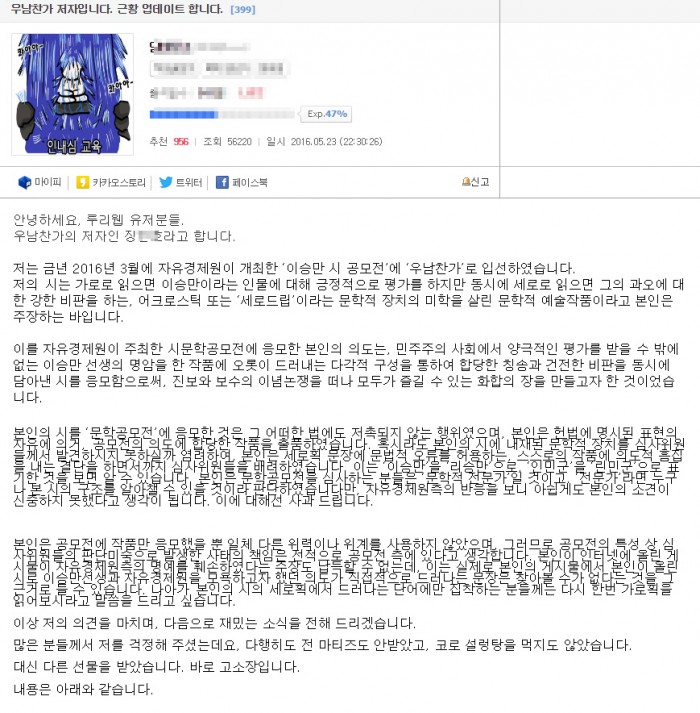 23일 오후 22시 30분쯤 온라인 커뮤니티 '루리웹'에는 자신이 우남찬가의 저자 장모씨이며 자유경제원으로부터 고소를 당했다는 내용의 글이 올라왔다.