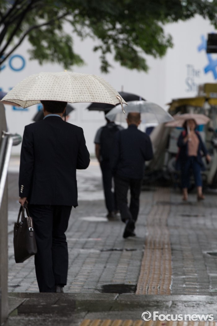 우산쓰고 출근하는 시민들