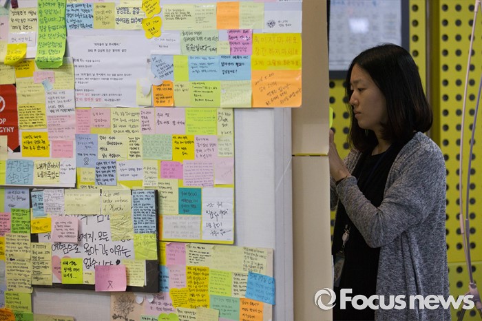 (서울=포커스뉴스) 강남역 인근 주점 화장실 살인사건 피해자 추모 공간이 옮겨진 서울시청 시민청에서 24일 오전 시민들이 추모글귀를 살펴보고 있다.