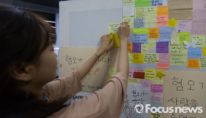 (서울=포커스뉴스) 강남역 인근 주점 화장실 살인사건 피해자 추모 공간이 옮겨진 서울시청 시민청에서 24일 오전 한 시민이 추모 쪽지를 붙이고 있다.