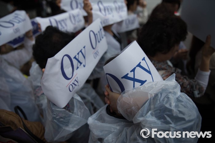 (서울=포커스뉴스) 24일 오후 서울 용산구 이마트 용산역점 앞에서 소비자단체들이 옥시 가습기 살균제 피해에 대한 사과와 보상, 옥시제품 유통업체에서 철수를 촉구하며 기자간담회를 갖고 있다.