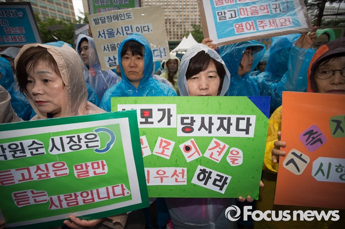 (서울=포커스뉴스) 24일 오전 서울 중구 서울시청 앞에서 열린 '서울시 발달장애인 부모 무기한 삭발결의 선포 기자회견'에 참석한 전국장애인부모연대 회원들이 손피켓을 들고 있다.