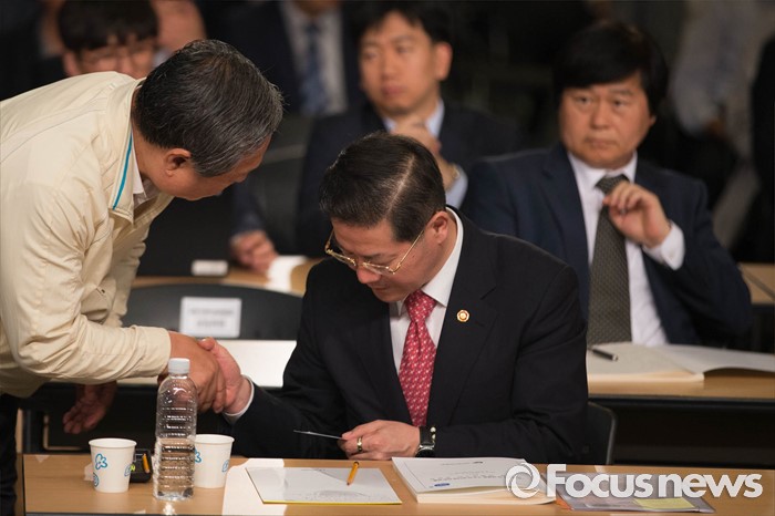 (서울=포커스뉴스) 24일 오후 서울 중구 포스트타워에서 열린 부정청탁 및 금품 등 수수 금지에 관한 법률(일명 김영란법) 입법예고안에 대한 공청회에 참석한 성영훈 국민권익위원회 위원장이 한 시민과 악수하고 있다.