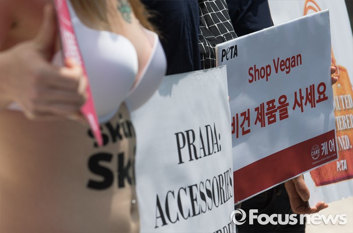 (서울=포커스뉴스) 25일 오후 서울 강남구 프라다매장 앞에서 동물보호단체 케어 관계자들이 프라다 타조 가방에 반대하는 퍼포먼스를 펼치고 있다.
