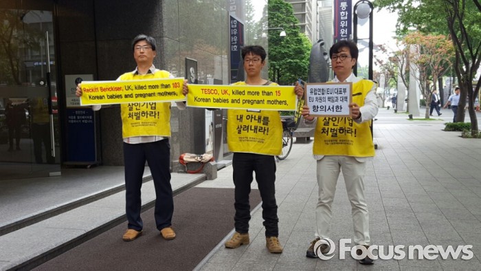 이들은 26일에는 RB의 본사가 있는 영국대사관을, 27일에는 가습기살균제 제조업체인 '세퓨'에 원료를 공급한 의혹을 받고 있는 케톡스(Ketox)사가 있는 덴마크대사관을 방문할 예정이다.가피모와 환경보건시민센터가 25일 오전 서울 종로구 주한 EU 대표부에 가습기살균제 사건 관련 책임 촉구 항의서한을 전달했다. 2016.05.25 정상훈 기자
