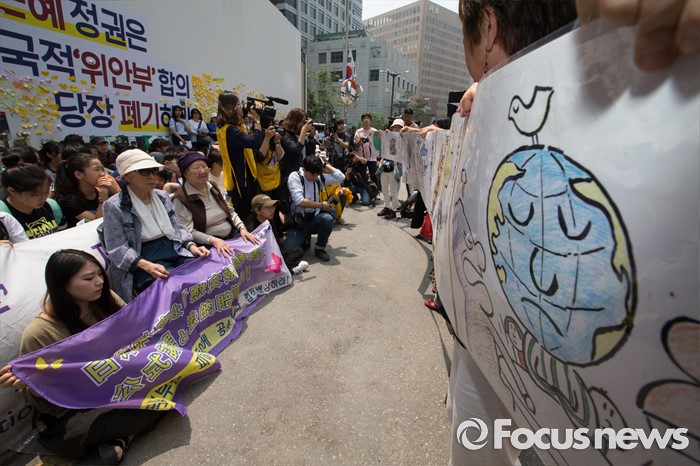 (서울=포커스뉴스) 25일 오전 서울 종로구 옛 일본대사관 앞에서 열린 '제1232차 일본군 위안부 문제해결을 위한 정기 수요시위'에서 일본인들이 김복동(왼쪽), 길원옥 할머니 앞에서 퍼포먼스를 선보이고 있다.