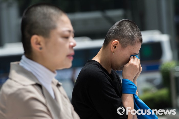 (서울=포커스뉴스) 25일 오전 서울 중구 서울시청 앞에서 열린 발달장애인 종합대책요구 무기한 삭발투쟁 2일차 기자회견에서 정희경(왼쪽) 전국장애인부모연대 서울지부 부대표