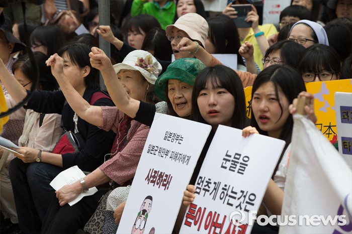 (서울=포커스뉴스) 25일 오전 서울 종로구 옛 일본대사관 앞에서 열린 '제1232차 일본군 위안부 문제해결을 위한 정기 수요시위'에 참석한 시민과 학생들이 구호를 외치고 있다.