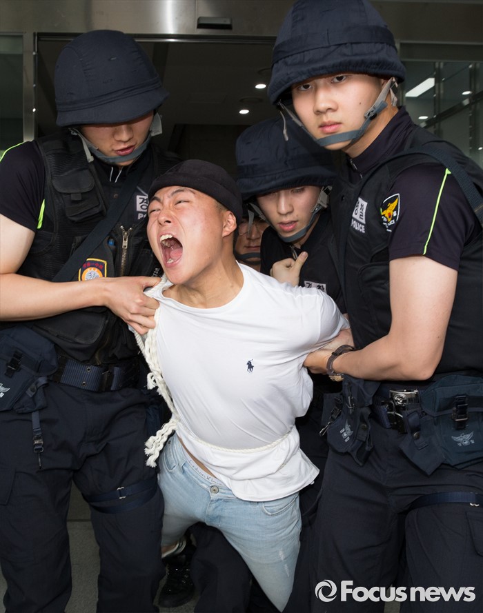(세종=포커스뉴스) 25일 오후 세종시 정부세종청사에서 열린 '정부세종청사 군ㆍ관ㆍ경 통합 방호훈련'에서 청사에 난입한 남성을 체포하는 훈련이 실시되고 있다.