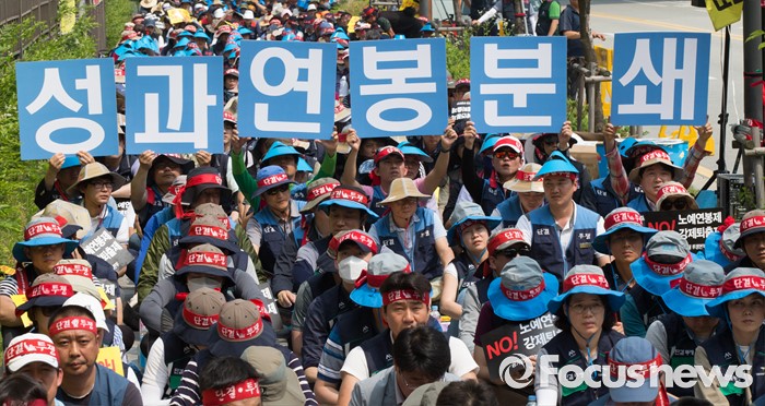 (세종=포커스뉴스) 25일 오후 세종시 정부세종청사 기획재정부 앞에서 공기업정책연대 구성원들이 성과연봉제 저지 및 강제퇴출제 반대 수요집회를 열고 성과연봉제 반대하는 구호를 외치고 있다.