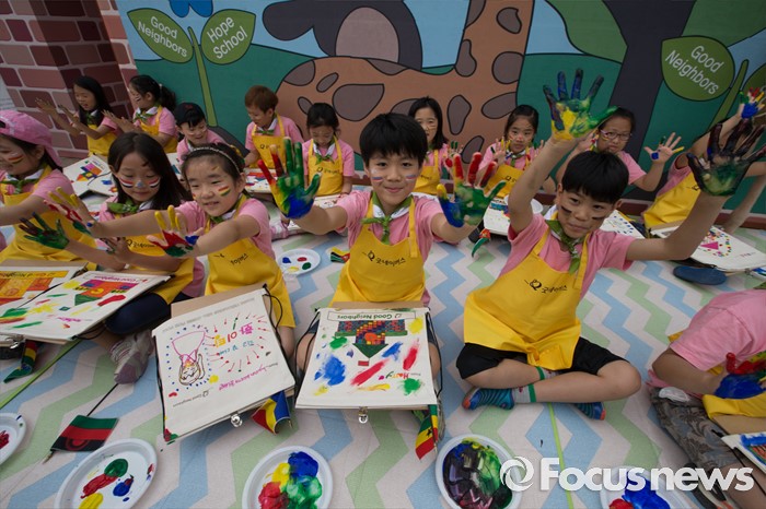 (서울=포커스뉴스) 26일 오전 서울 광진구 어린이대공원에서 열린 굿네이버스 '아프리카 희망학교 체험전'에서 초등학교 학생들이 아프리카에 보낼 가방을 완성한 후 기념촬영을 하고 있다.