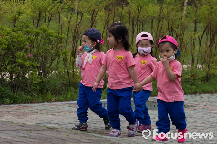 (서울=포커스뉴스) 미세먼지 농도가 나쁨 수준인 26일 오전 서울 광진구 어린이대공원에서 마스크를 쓴 어린이들이 지나가고 있다.