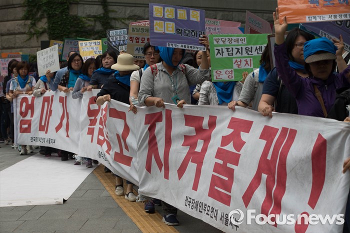 (서울=포커스뉴스) 26일 오전 서울시청 정문앞에서 전국장애인 부모연대와 서울특수학교학부모협의회원들이 발달장애인 정책 수립을 촉구하며 행진을 하고 있다.