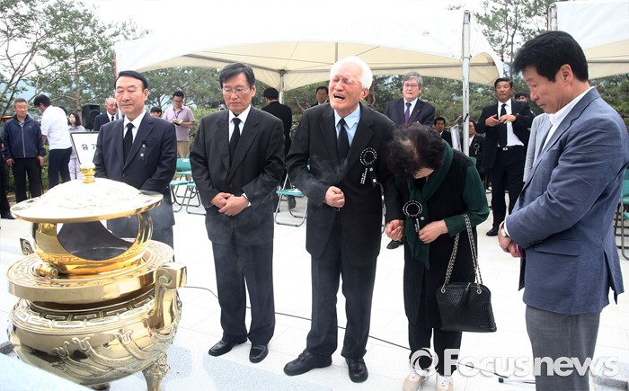 (서울=포커스뉴스) 최형우(왼쪽 세번째) 전 내무부 장관이 26일 오후 서울 동작구 국립서울현충원에서 열린 고 김영삼 전 대통령 묘비 제막식에 앞서 참배하며 통곡하고 있다.