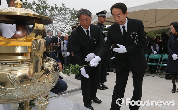 (서울=포커스뉴스) 26일 오후 서울 동작구 국립현충원에서 열린 고 김영삼 전 대통령 묘비 제막식에서 고 김 전 대통령의 차남 김현철 교수와 가족들이 헌화 및 분향을 하고 있다.