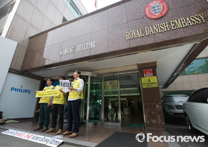(서울=포커스뉴스) 환경보건시민센터 관계자들이 27일 오전 서울 용산구 주한 덴마크대사관 앞에서 가습기살균제 사건 관련 덴마크 정부 행동 촉구 항의서한 전달 기자회견을 하고 있다.