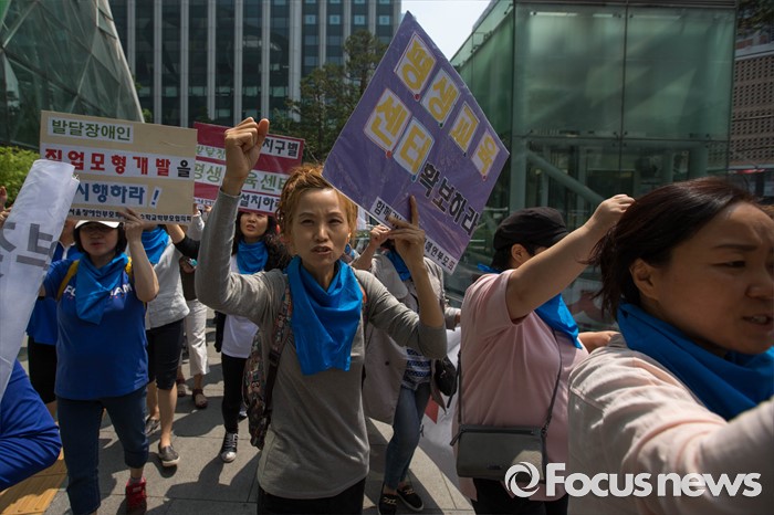 (서울=포커스뉴스)27일 오전 서울 중구 서울시청 앞에서 전국 장애인 부모연대와 서울특수학교학부모협의회 회원들이 발달장애인 정책 수립을 촉구하며 삭발식을 하기 위해 시청 앞으로 향하고 있다.