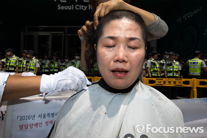 (서울=포커스뉴스)27일 오전 서울 중구 서울시청 앞에서 전국 장애인 부모연대와 서울특수학교학부모협의회 회원들이 발달장애인 정책 수립을 촉구하며 삭발식을 하고 있다.