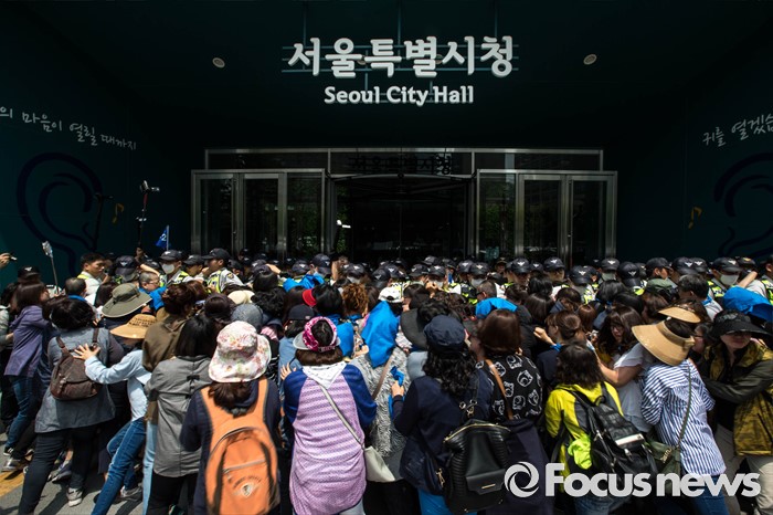 (서울=포커스뉴스) 27일 오전 서울 중구 서울시청 정문 앞에서 삭발식을 끝낸 전국장애인 부모연대와 서울특수학교학부모협의회 회원들이 박원순 서울시장에게 전달하려 시청 진입을 시도하다 경찰에 가로막히자 경찰 병력과 몸싸움을 벌이고 있다.
